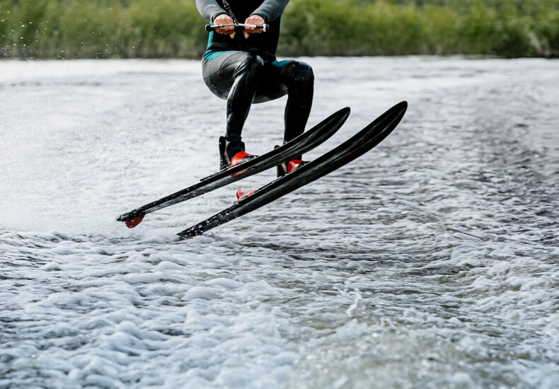 Man waterskiing on lake behind