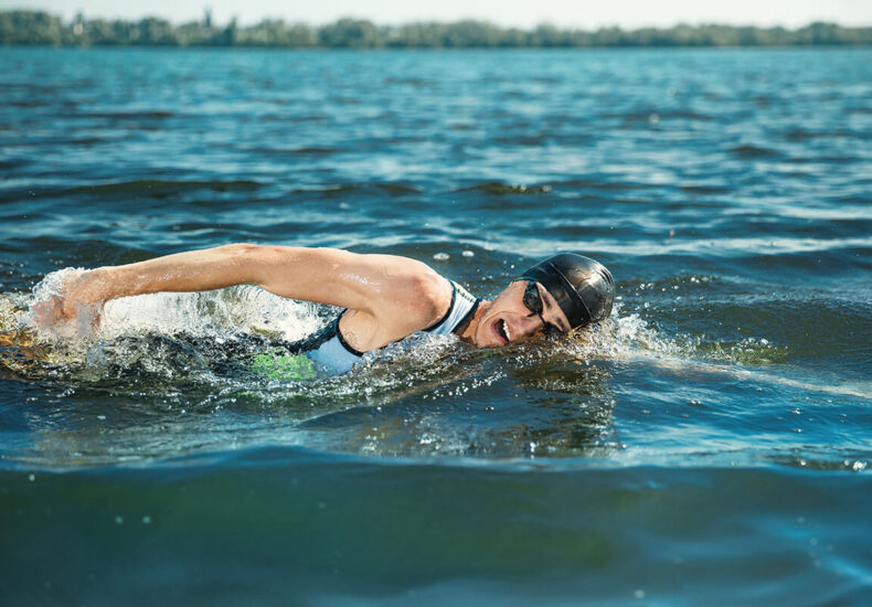 Professional triathlete swimming in river